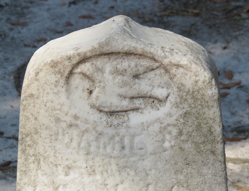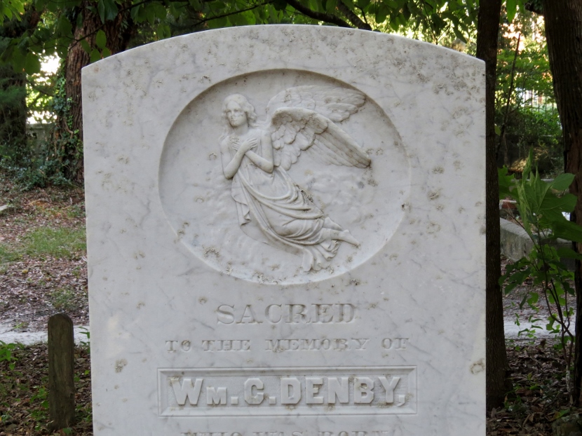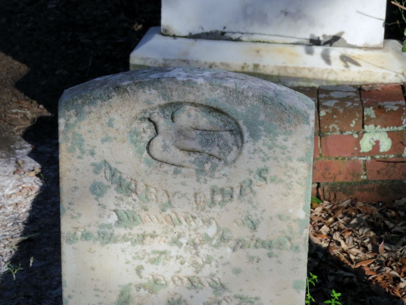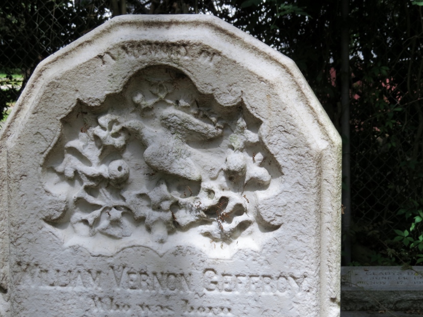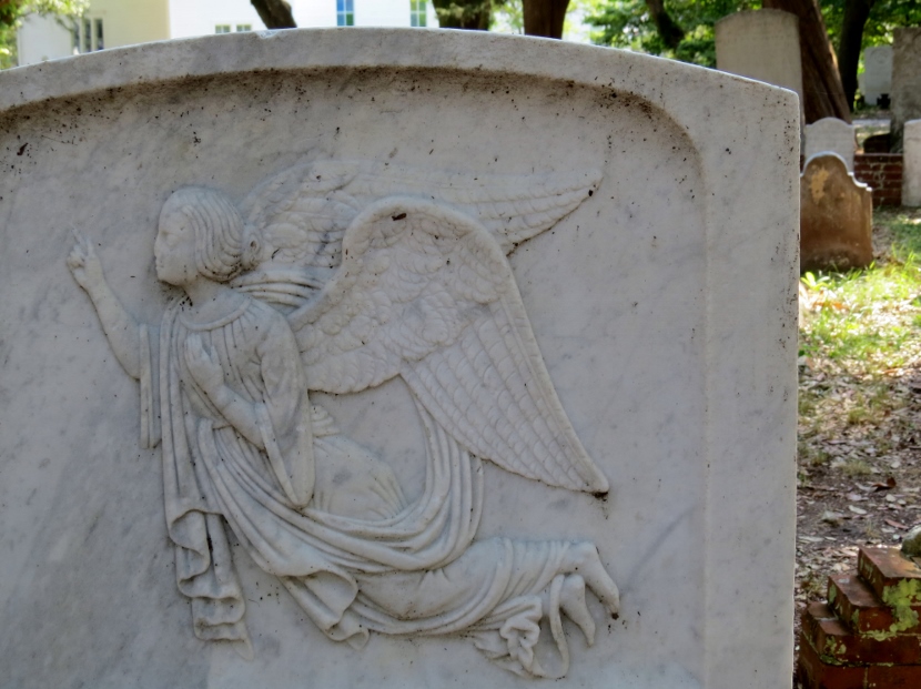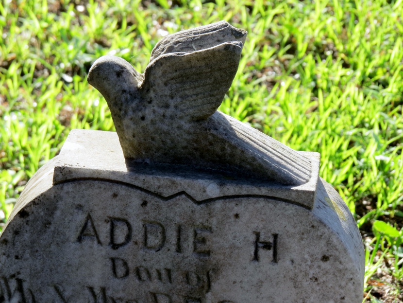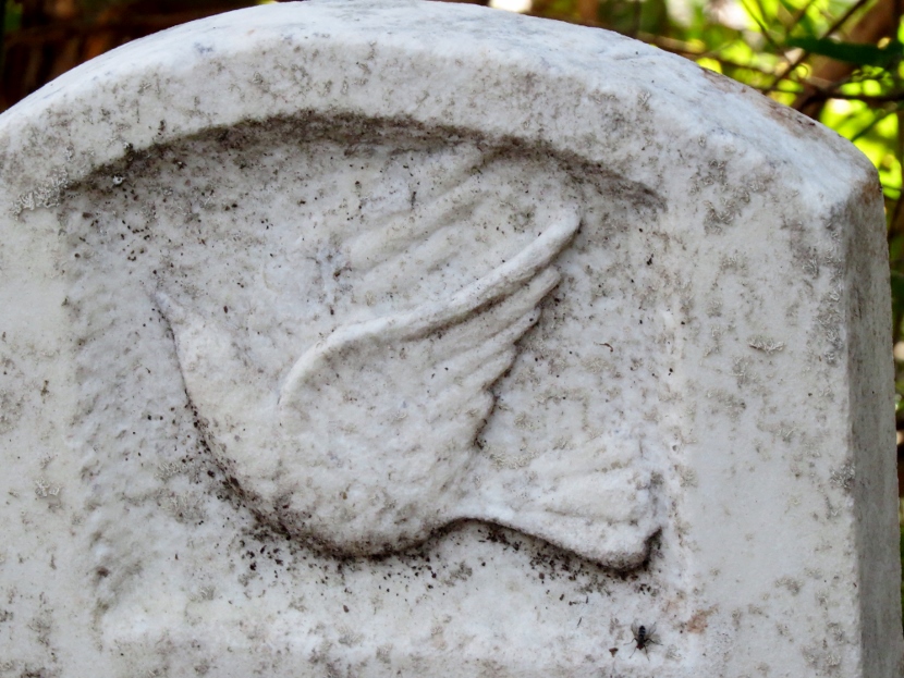 Not exactly a bird, but a common “bird-like” decoration on gravestones is a winged angel, like these (also flying toward the left) …