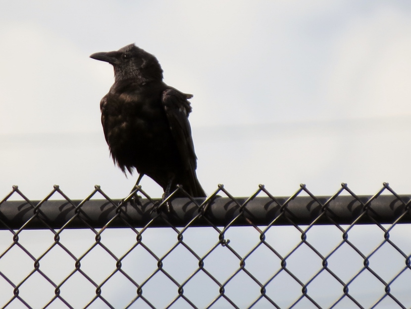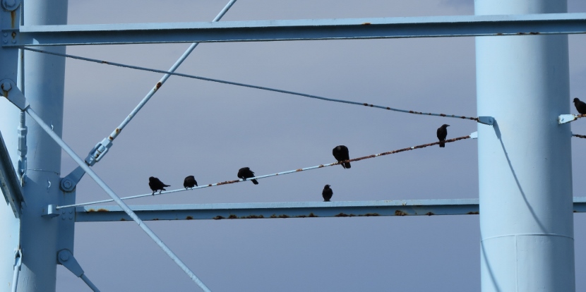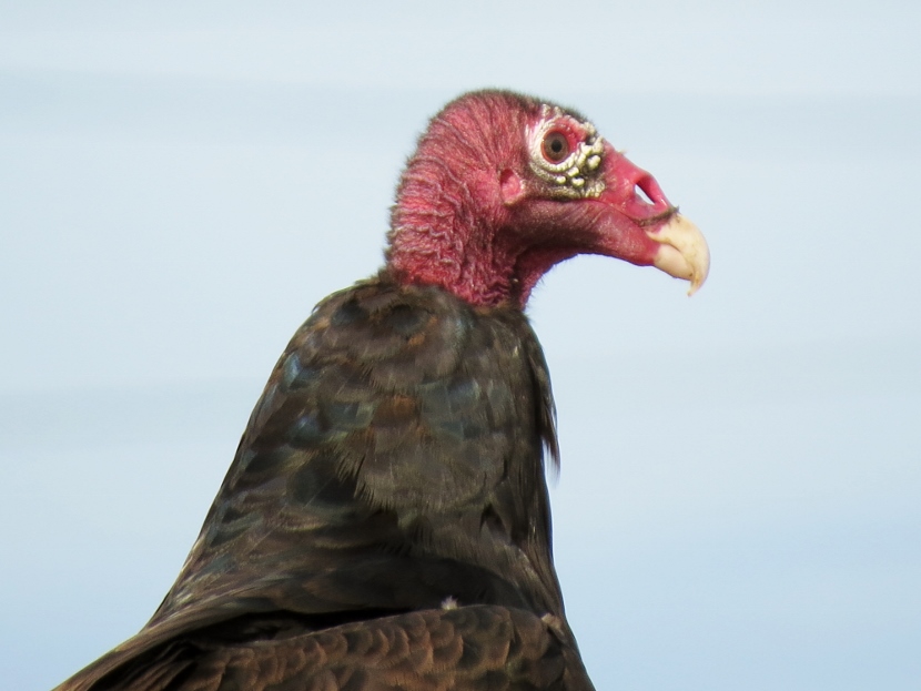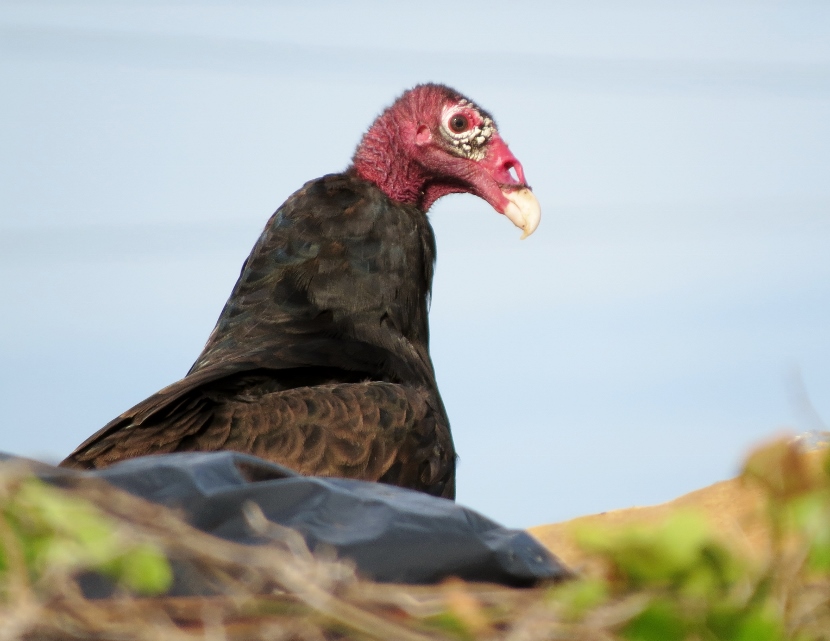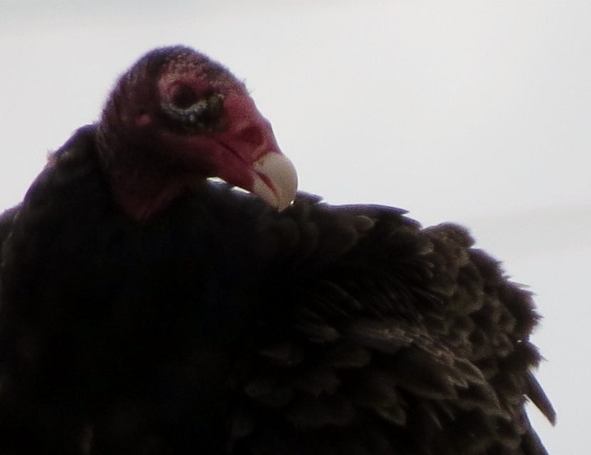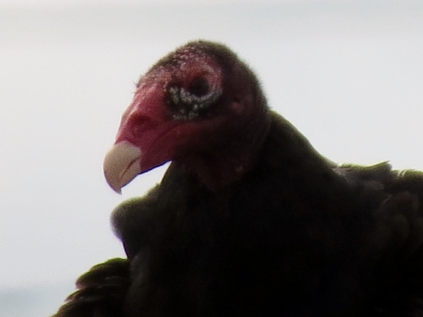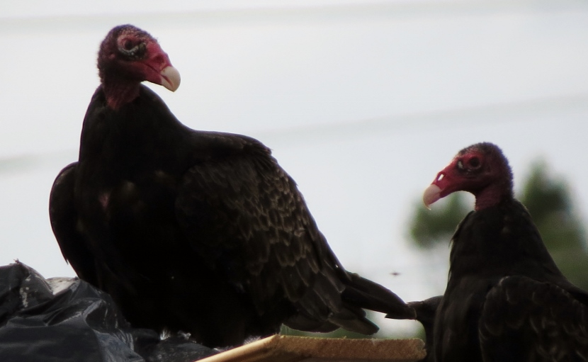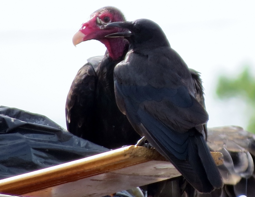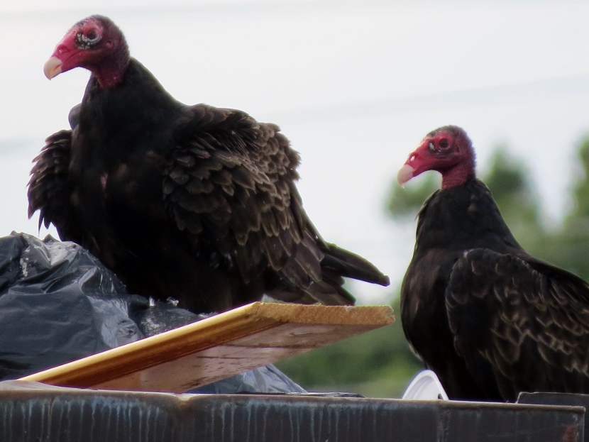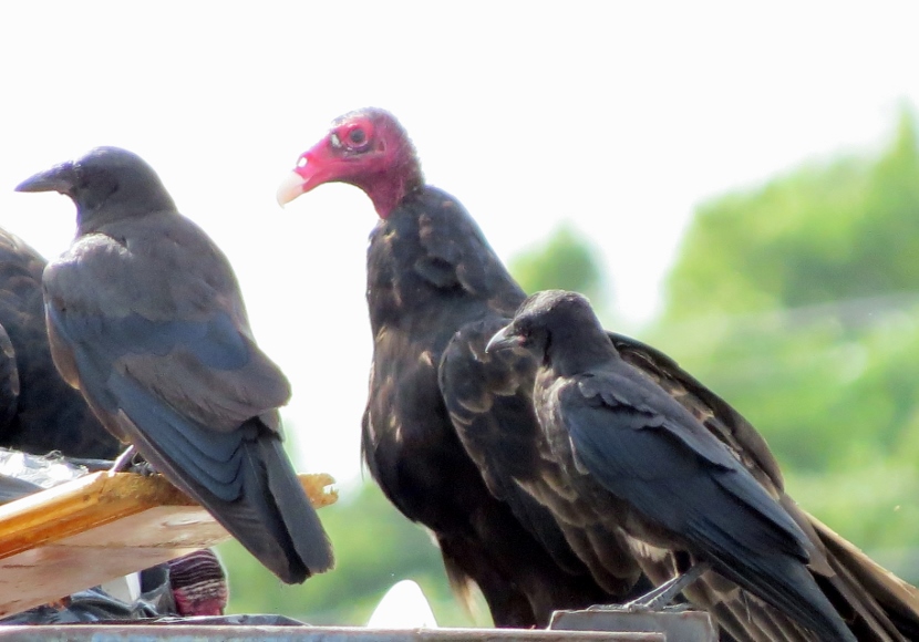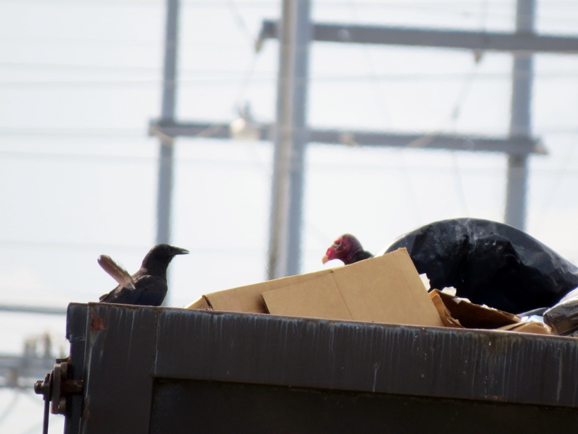 Dumpster Divers On a hot, humid day in July, I was riding my bike, keeping a watchful eye out for birds. I spotted some bird action near a dumpster at the town’s Public Works Facility, a fenced-in block of utility buildings are vehicles beneath the town’s 130- foot-tall water tower. A group of Turkey vultures (Cathartes aura) were sitting on an open dumpster, poking around. Normally, I only see them soaring, never down on the ground inside the town limits. Something must have caught their attention and attracted them, dead fish perhaps. Crows, the other local scavenger species, shared the feast with the vultures. The birds looked sluggish in the midday heat … Crow surveying the site. More crows waited on the water tower. The featherless head of the turkey vulture, covered with bristles, may not be attractive or endearing by human standards, but these birds have a certain majesty about them… Let us praise the noble turkey vulture: no one envies him; he harms nobody; and he contemplates our little world from a most serene and noble height.Edward Abbey Here are related bird posts to visit: Rooftop Eagle (with Black Vulture photos) >>“Grub Hunters” >>Lessons in survival from a one-legged Jay >> Please follow and like: Share this: Share on Facebook (Opens in new window) Facebook Share on X (Opens in new window) X Like this:Like Loading... Post navigation Birds in the Old Burying GroundWinter Look-alikes