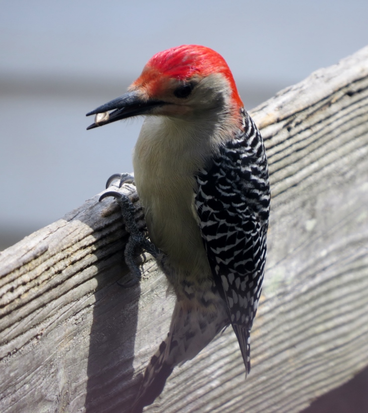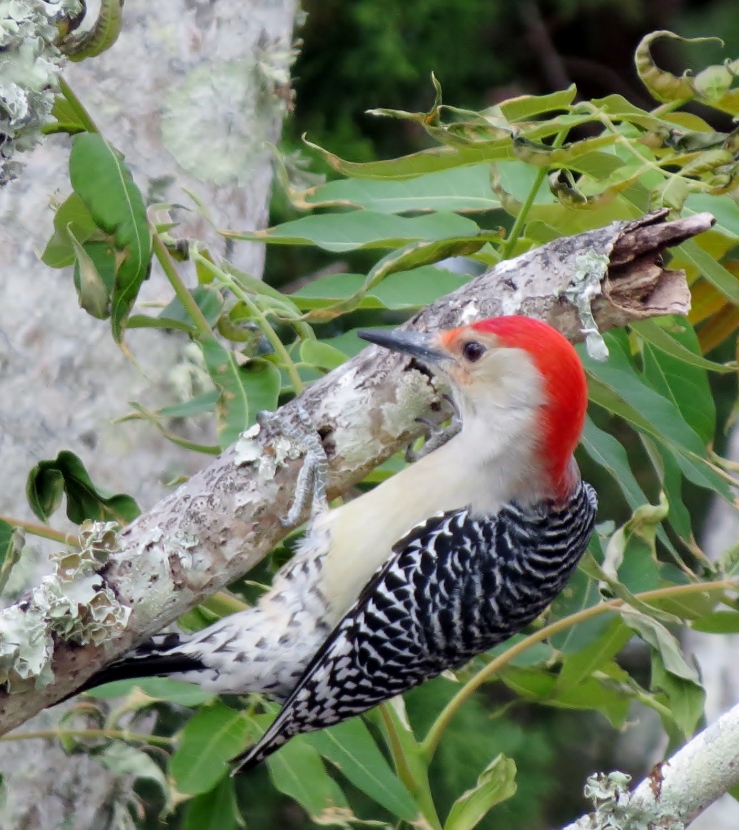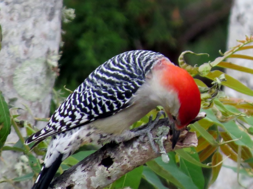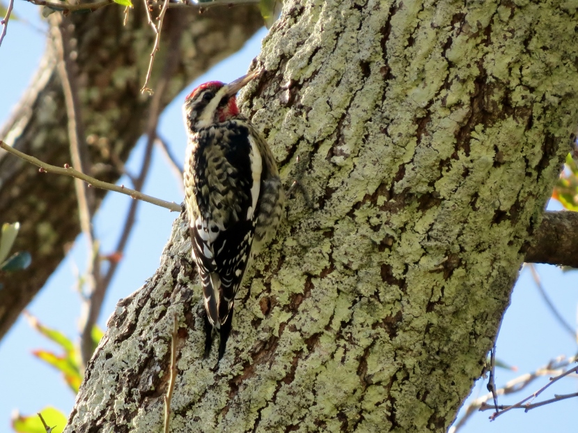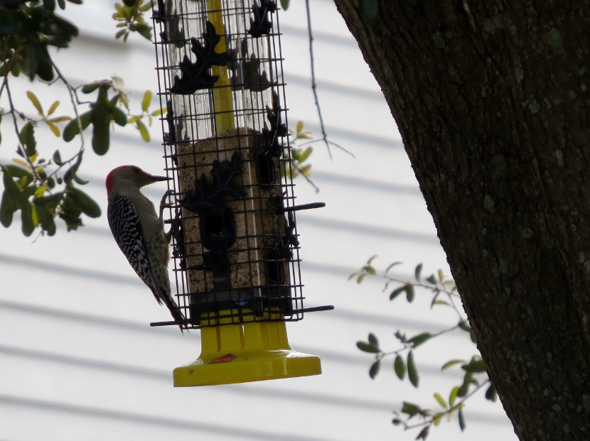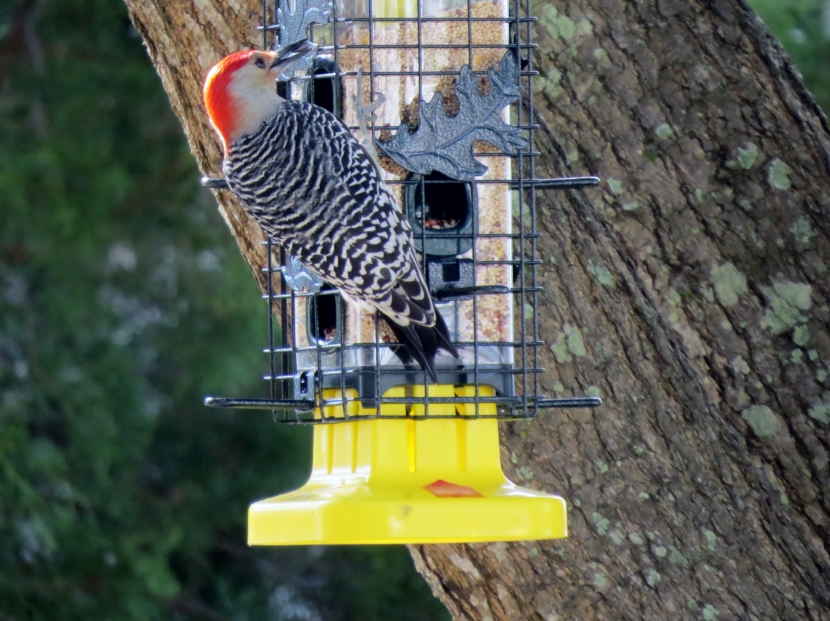 Two Woodpeckers and a Sapsucker Imagine my surprise, when I looked out the kitchen windowto see a woodpecker eating at the bird feeder. It was a Red-bellied Woodpecker, Melanerpes carolinus. A few days later, I saw what I assumed was the same individual at a neighbor’s bird feeder. It’s definitely the male of the species He then poked around for insects in the bark of a nearby tree. The Downy Woodpecker (Picoides pubescens) sometimes visits my feeders. In winter my backyard is home to another variety of woodpecker, the Yellow-bellied Sapsucker (Sphyrapicus varius). Woodpeckers are not the only birds that provide a burst of red color … Northern Cardinal Pair of House Finches Male House Finch Male Cardinal “Look at the trees, look at the birds, look at the clouds, look at the stars… and if you have eyes you will be able to see that the whole existence is joyful.” Osho Happy Birding! Here are related bird posts to visit: Feathered Graveyard Visitors >>Fence Sitters >>Winter Loons and Mergansers >> Please follow and like: Share this: Share on Facebook (Opens in new window) Facebook Share on X (Opens in new window) X Like this:Like Loading... Post navigation Ducks on a California LakeWild Turkeys