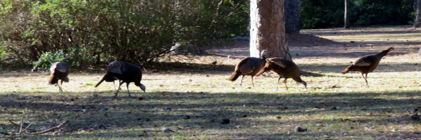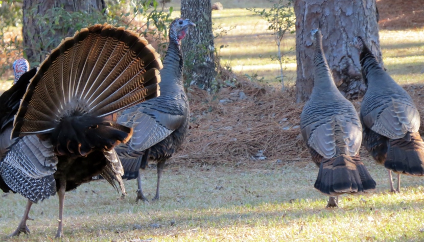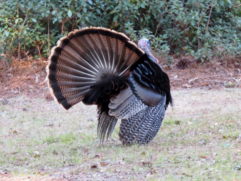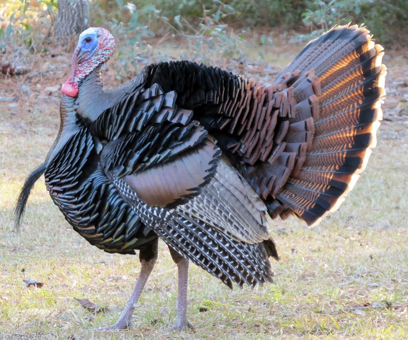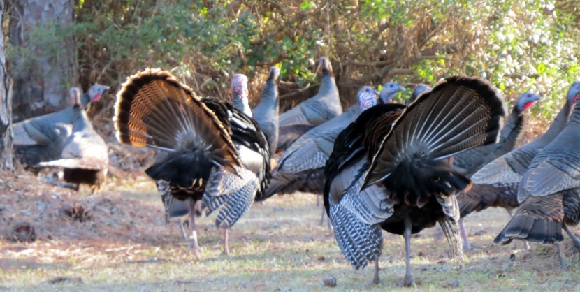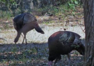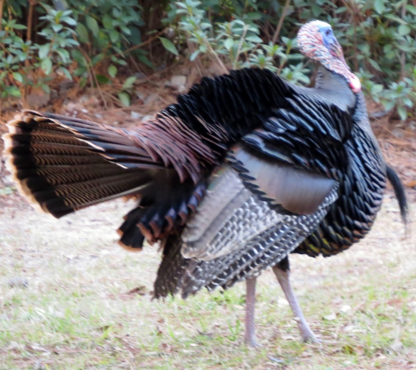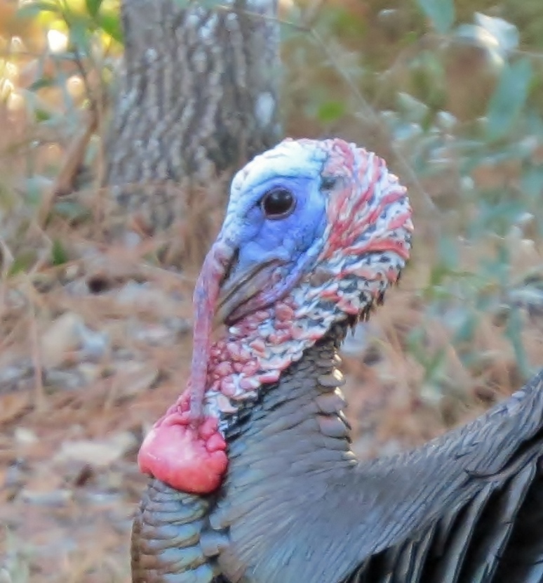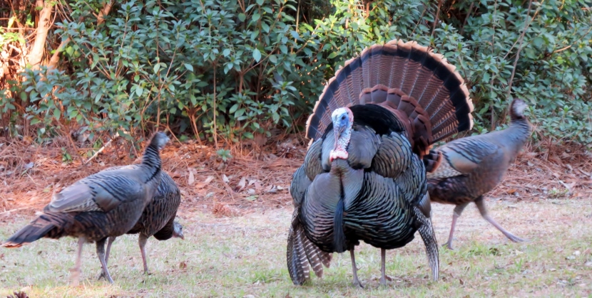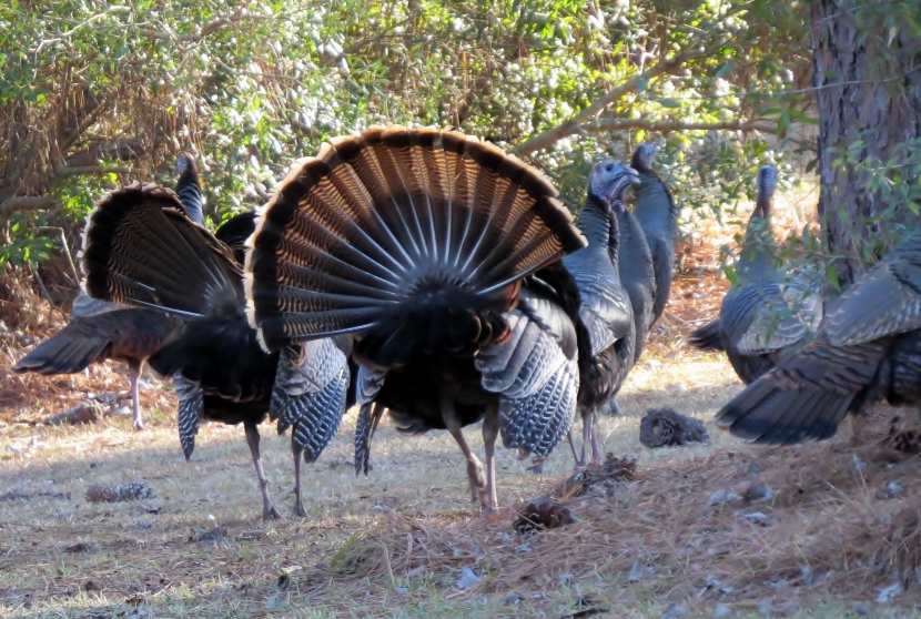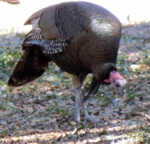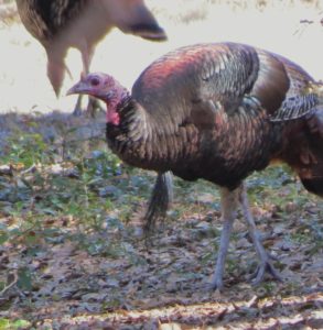 Wild Turkeys One tom and four hens grazing. It was late January, when I jumped out of the car to photograph a large flock of wild turkeys (Meleagris gallopavo). About 35 adult birds scratched and pecked at the grass between the road and a woodsy area. Then they crossed the road in front of my pulled-over car, heading into the forest on the other side. These birds were already beginning their courtship rituals. “Tom” fluffing his feathers. Fanning his tail, dragging wing tips on the ground. Struting in front of females with tail fanned. Note the “beard” sticking out from his chest. Tom turning around. After the flock crossed the road, another tom puffed up and the two strutted around as the entire group drifted into the forest. Two strutting toms. Competing for the hens’ attention. The turkey’s unfeathered head has several distinctive features. The snood is the flap of skin that hangs down over the bill. It changes in color, size, and shape based on the bird’s mood and activities. The wattle is a skin flap reaching from the beak to the neck. Those bumps of flesh covering the necks and heads are called caruncles. Snood, wattle and caruncles are deeply colored during strutting behavior. Later that day, I spotted another small flock of wild turkeys. This was composed entirely of juvenile males, called jakes. Note that they each have a small beard. Click on any image above to enlarge or start slideshow. HERE’S A BIT OF TURKEY TRIVIA … If Benjamin Franklin had his way, the wild turkey would have been chosen as the National Bird. He wrote in 1784: For my own part I wish the Bald Eagle had not been chosen the Representative of our Country. He is a Bird of bad moral character. He does not get his Living honestly. You may have seen him perched on some dead Tree near the River, where, too lazy to fish for himself, he watches the Labour of the Fishing Hawk; and when that diligent Bird has at length taken a Fish, and is bearing it to his Nest for the Support of his Mate and young Ones, the Bald Eagle pursues him and takes it from him….. The Turkey is in Comparison a much more respectable Bird, and … a true original Native of America … He is besides, though a little vain & silly, a Bird of Courage, and would not hesitate to attack a Grenadier of the British Guards who should presume to invade his Farm Yard with a red Coat on. Check these other posts about bald birds… Rooftop Eagle >>Dumpster Divers >> Please follow and like: Share this: Share on Facebook (Opens in new window) Facebook Share on X (Opens in new window) X Like this:Like Loading... Post navigation Two Woodpeckers and a SapsuckerNight Stalker of the Boardwalk