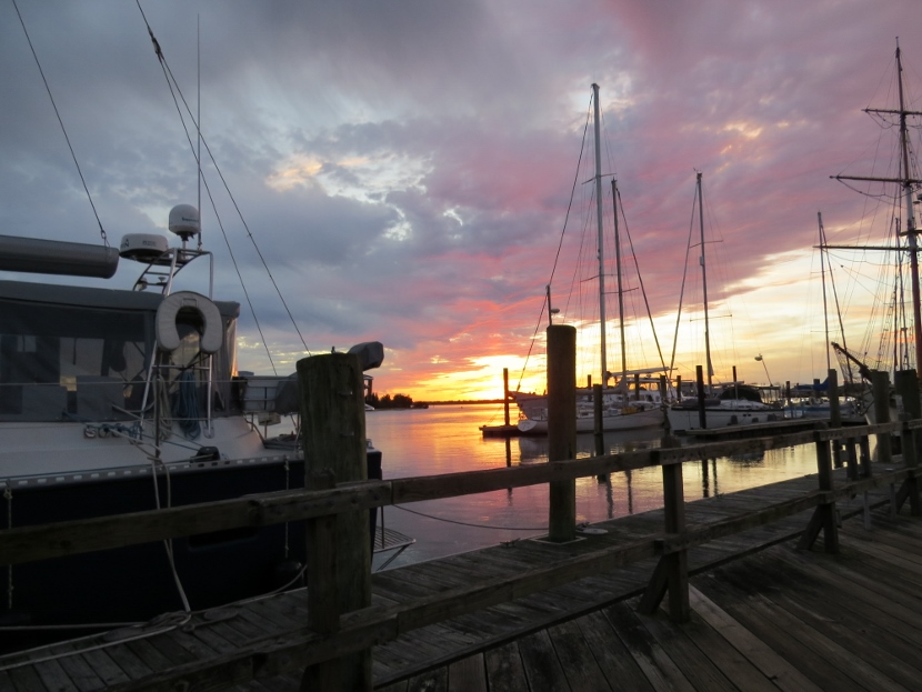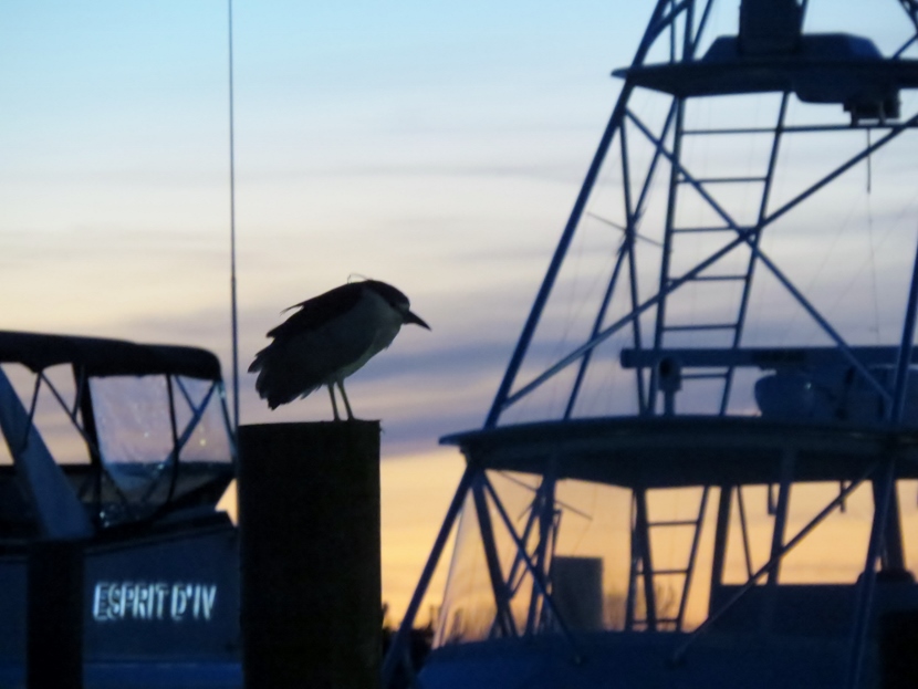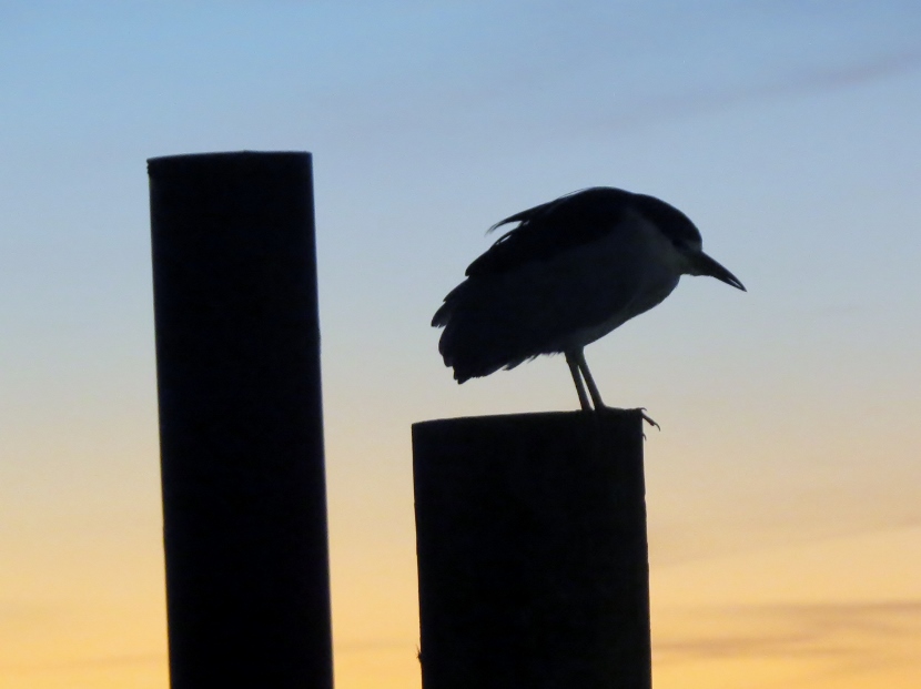 Strolling along the waterfront boardwalk in Beaufort, I watch the sunset and photograph the spectacular winter sky. In the growing dimness, a large bird lands on a pier piling, emitting an undignified “quok” sound.