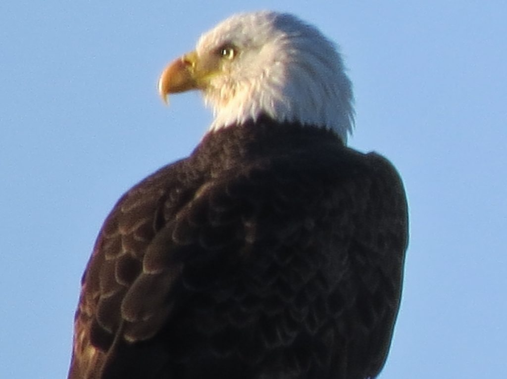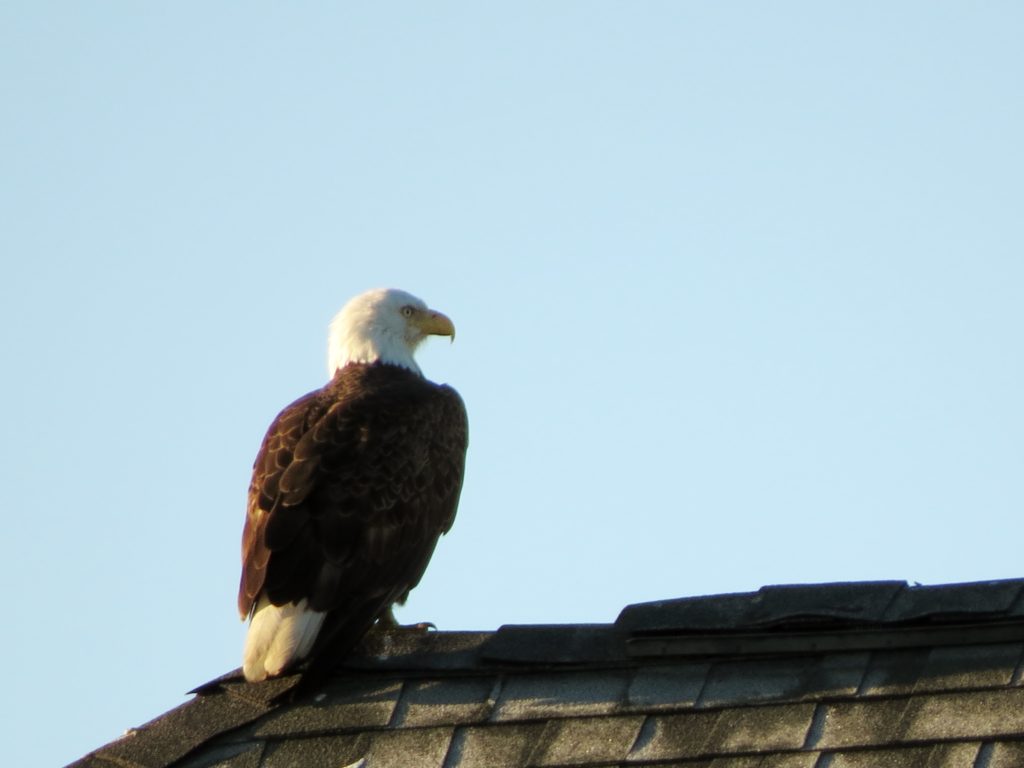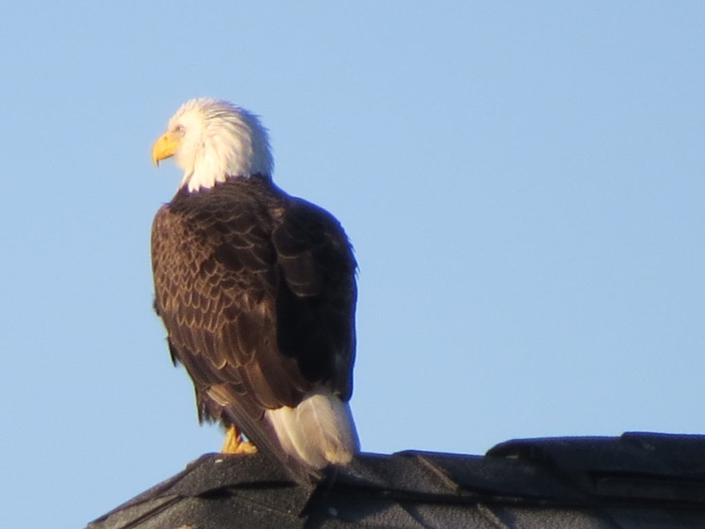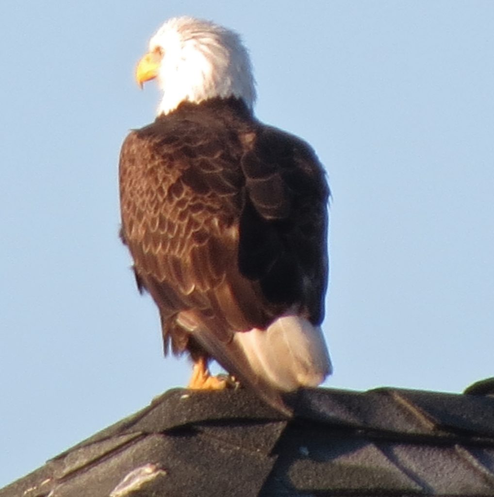 The Bald Eagle, probably a male, was perched atop a two-story house that overlooked the coastal marsh. He stood quite still, moving only his head. In the early morning light, I felt privileged to be in the presence of our national bird, grateful for his tolerance.