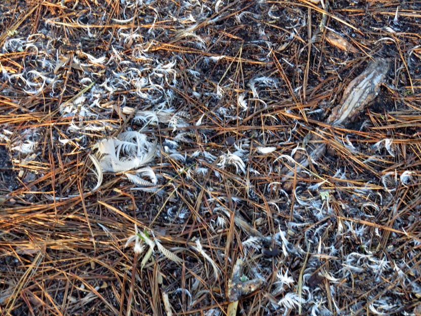 I found a likely home base for this bird and his mate, located away from the houses, atop a very tall pine tree on an undeveloped spit of land. Here’s the clue I found that indicated nesting activity …