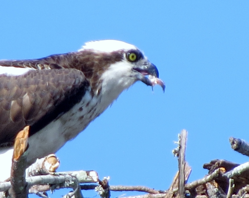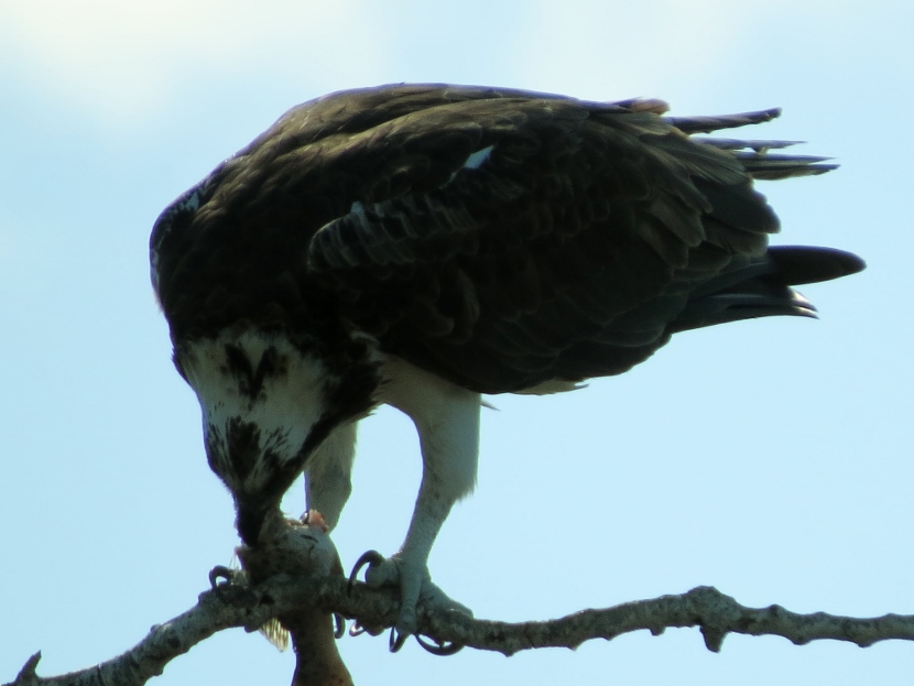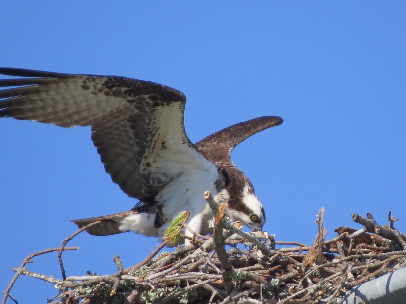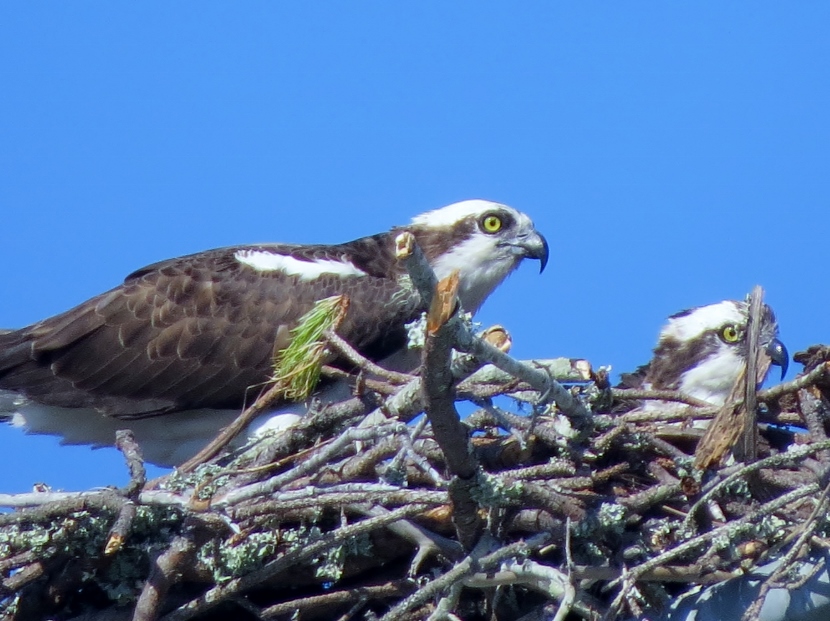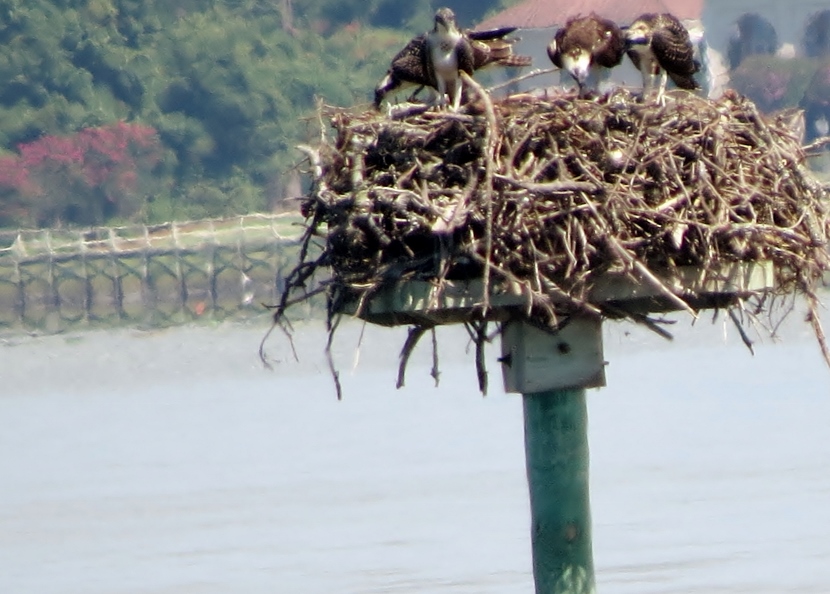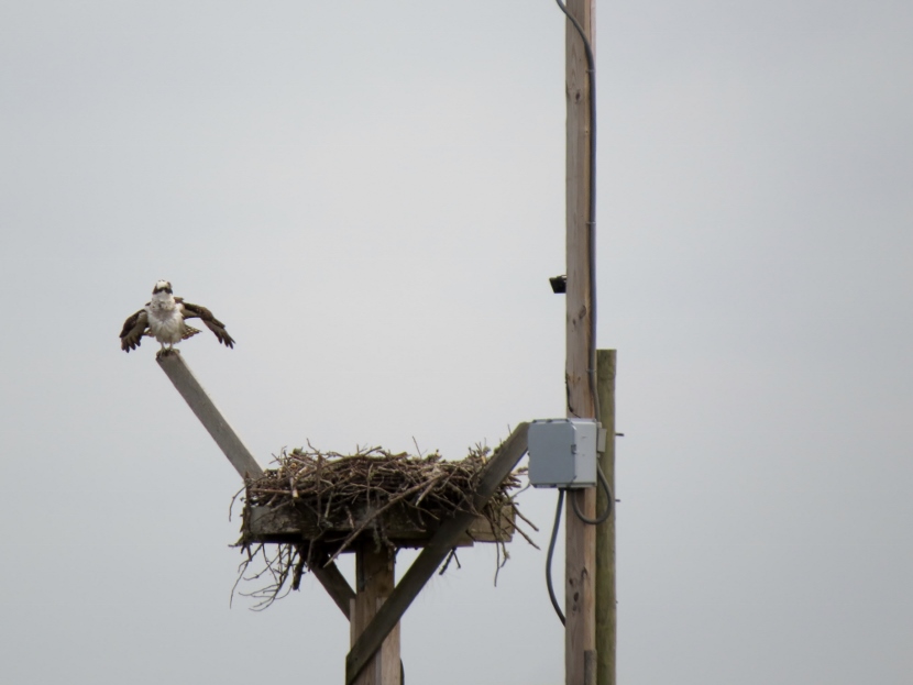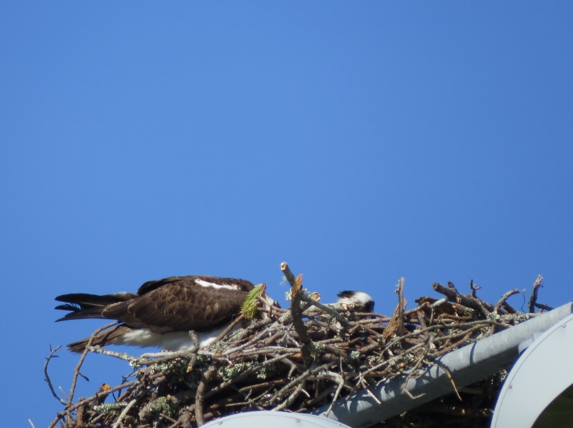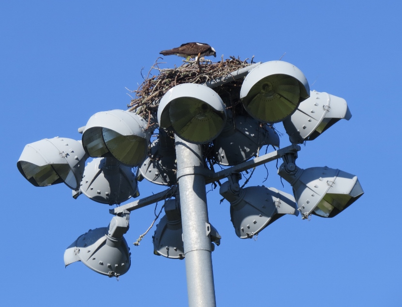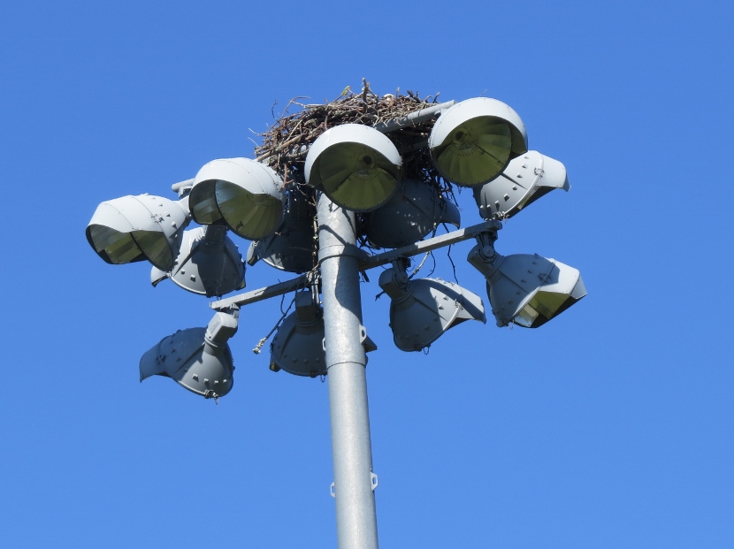 The soccer field at Freedom Park, a county recreation area, was deserted on that afternoon in May. Except for the activity of ospreys in their nest, built on top of a pole holding field lights, at least fifty feet above the ground. Normally these coastal raptors nest on something closer to the water, like a channel marker or or a specially-designed nest platform.
