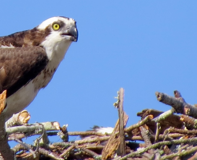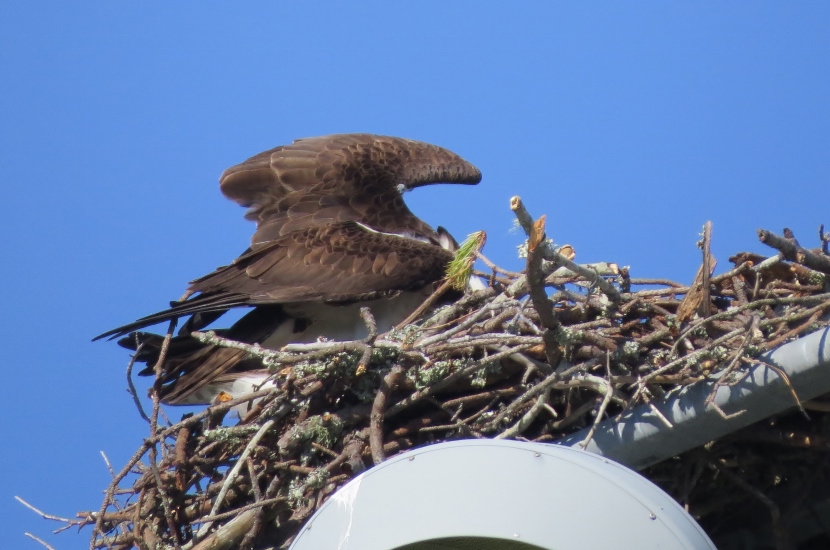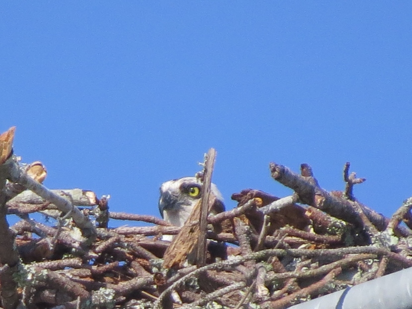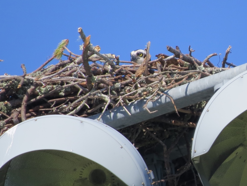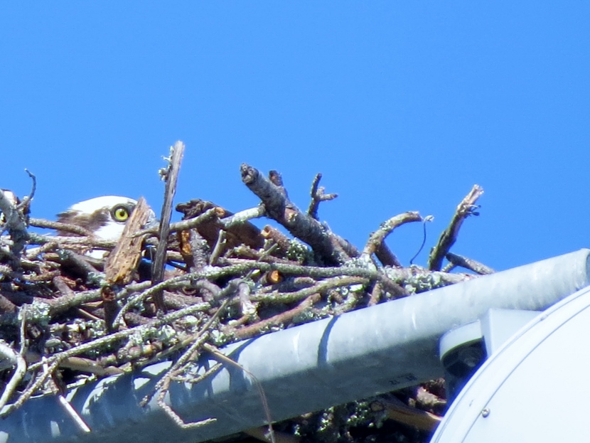 In the nest above the soccer field a single adult osprey was most likely incubating one or more eggs. Occasionally, she emitted a high-pitched cry.
