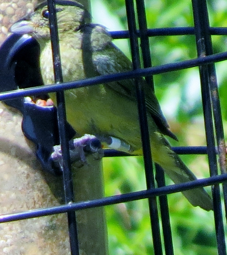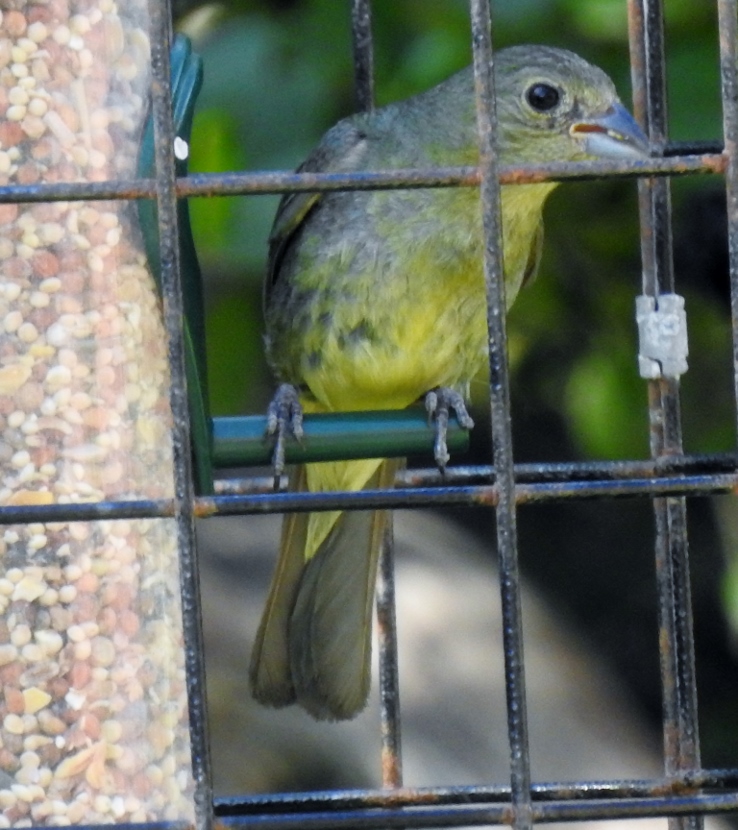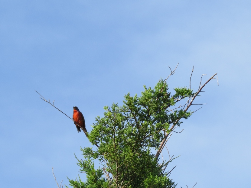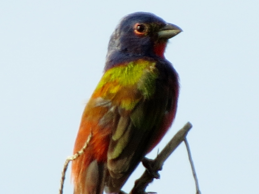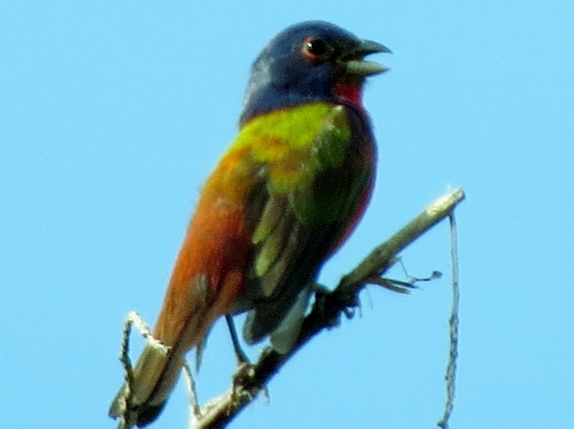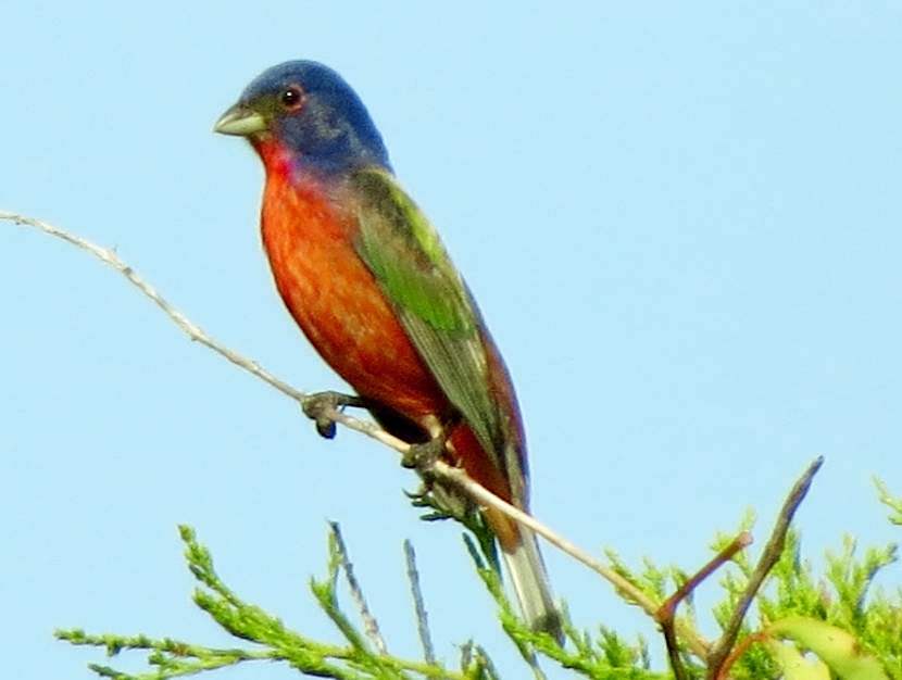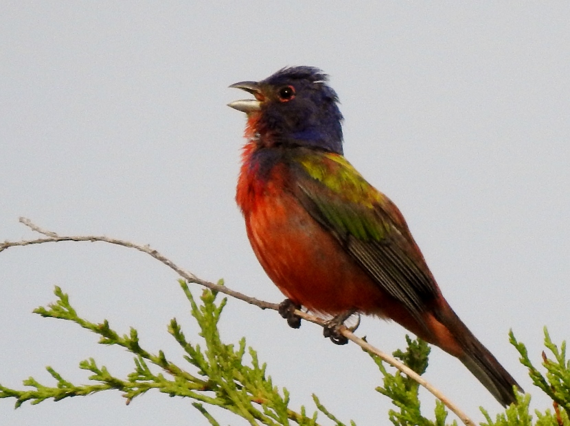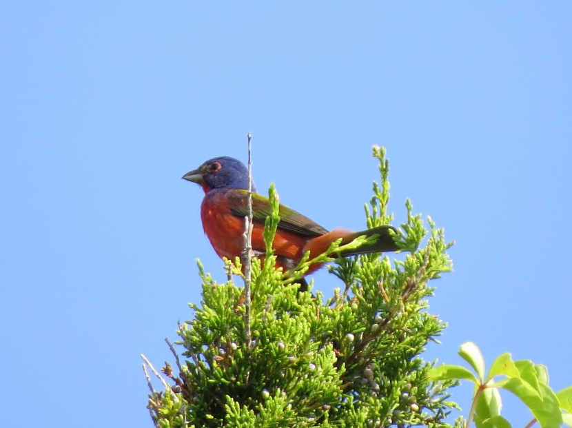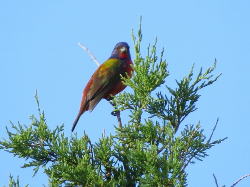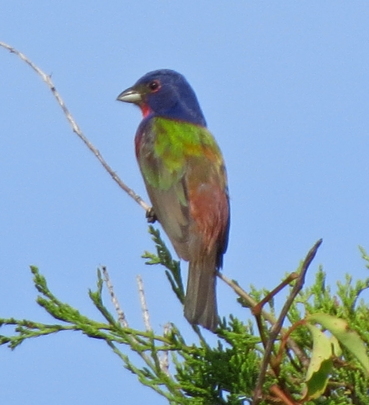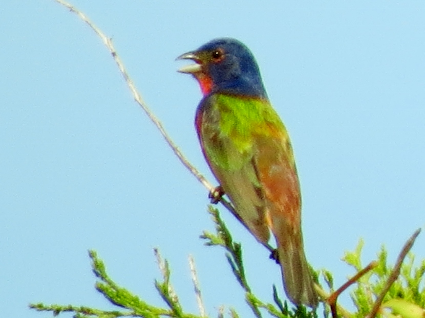 Painted Bunting This is a male Painted Bunting (Passerina ciris) in full breeding plumage, singing from the top of an Eastern Red Cedar tree. Each individual is a rainbow of colors… In this closer look, you can clearly see the reddish eye-ring of the male. Less common than its relative, the cardinal, Painted Buntings have a limited habitat, confined to maritime shrub thickets close to the shore. Unfortunately, such areas are disappearing rapidly due to coastal development, leaving only protected public lands for maritime forests. Maritime Shrub Thicket I found these birds in the shrub thickets around the Radio Island Beach Access. It’s almost impossible to see the Painted Buntings within the dense vegetation, except when the male sings from an exposed perch in breeding season. Females seem to be silent and elusive, almost impossible to see, camouflaged in green feathers. Fortunately, they come to feeders… Female Painted Bunting Note: this bird is banded. Painted Buntings are only summer residents in coastal North Carolina. As soon as winter approaches, they migrate south to wintering grounds at the southern tip of Florida, or farther south to Cuba, the Caribbean and Central America. They migrate back again in spring. Here are some other interesting birds to meet… The Birds of Black >>Great-crested Flycatcher >>Two Woodpeckers and a Sapsucker >>Encountering Green Herons >>Fence Sitters >>Birds in the Old Burying Ground >>Hard to See >> Please follow and like: Share this: Share on Facebook (Opens in new window) Facebook Share on X (Opens in new window) X Like this:Like Loading... Post navigation Great-crested FlycatcherYellow-billed Cuckoo