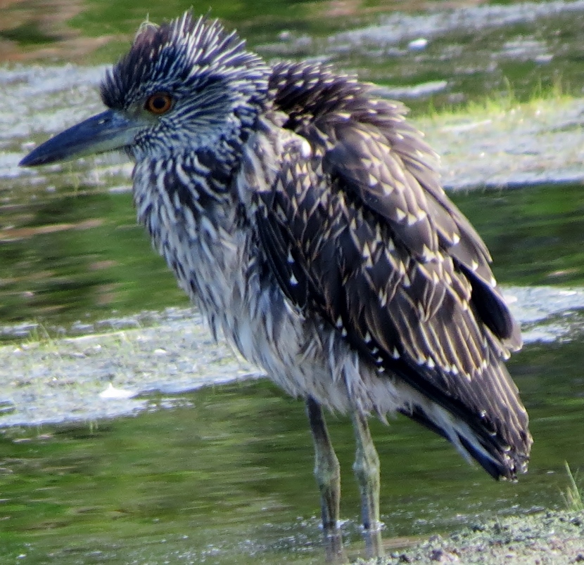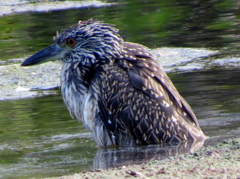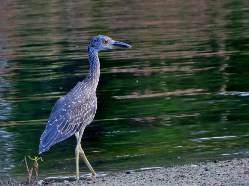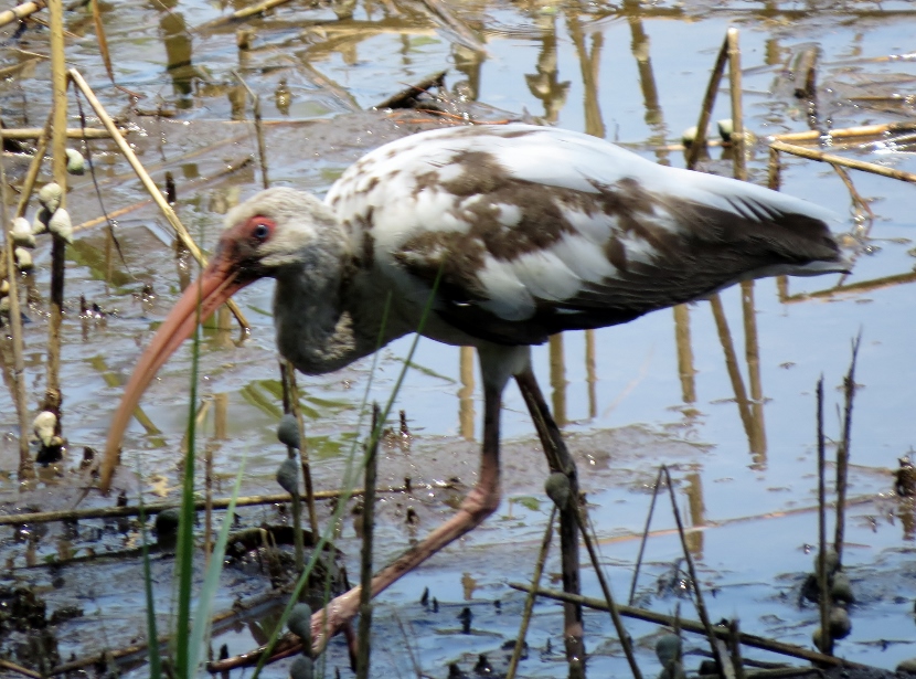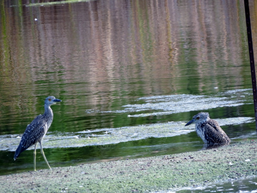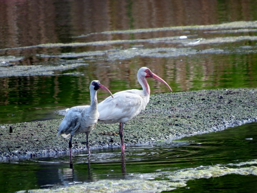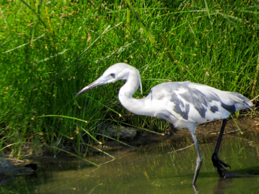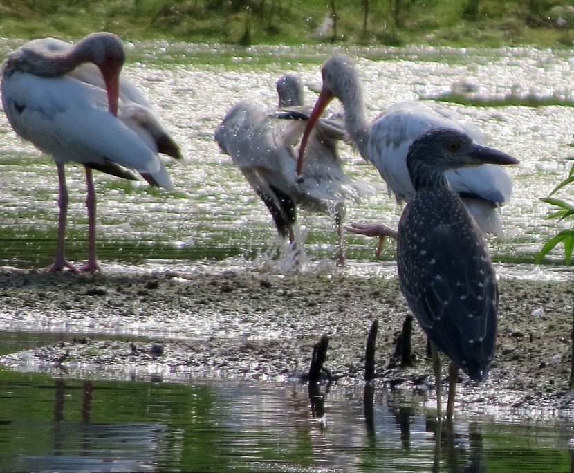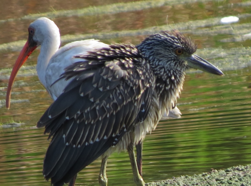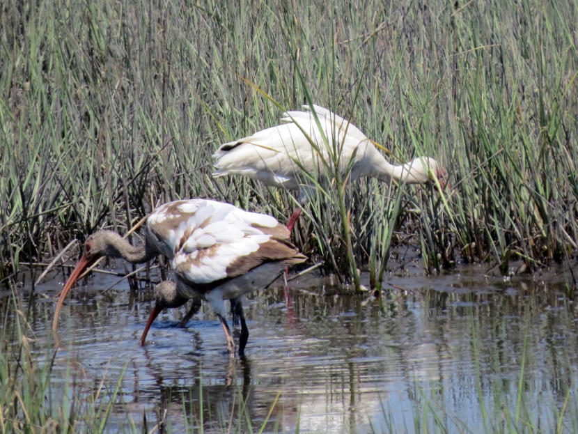 Fledglings of Estuary Birds White Ibis adult (right) and juvenile. Fledgling ibises (left) with mottled feathers. Fledgling White Ibis Young wading birds generally stay in or near their nests longer than small land birds (see 2019 Fledglings). The fledgling White Ibis, in the above photographs, remains in the nest for three weeks after hatching. After another week or two, it’s able to make short flights and is capable of sustained flight after six weeks. Here’s a fledged Green Heron, fishing alone from a dock, probably about two months old. One day in August, among a flock of ibises, I spotted other splotchy-colored fledglings — two immature Yellow-crowned Night Herons… Below are the two birds side by side. The bird on the left has its neck stretched to full length, while the one on the right is scrunched down and seated on the ground, feathers wet and spiky. This next bird, a Snowy Egret, resembles the adult, having white feathers. Its legs are greenish, rather than black like the adult… It takes about a year for immature wading birds to attain their adult plumage. In the case of the Little Blue Heron, the transition leaves the young bird with a mottled patchwork of blue and white feathers… Immature Little Blue Heron Here’s the adult plumage for comparison… Little Blue Heron Fledglings of another common estuary bird, the Canada Goose, start following their parents away from the nest only one or two days after hatching, beginning to feed themselves immediately. The family remains close together for about two months, until the young birds begin to fly. Here’s a fuzzy young gosling with its parent… A bird does not change its feathers because the weather is bad. Nigerian saying Here are some other of my posts about young birds… 2019 Fledglings >>Great-horned Owl Nestlings >>2018 “Young’uns” >> Please follow and like: Share this: Share on Facebook (Opens in new window) Facebook Share on X (Opens in new window) X Like this:Like Loading... Post navigation 2019 FledglingsA Killdeer Family