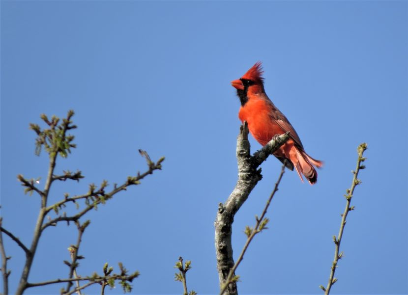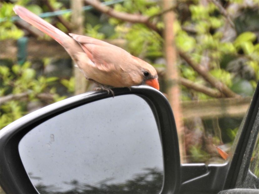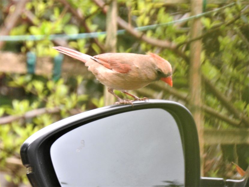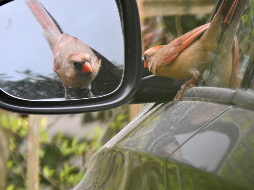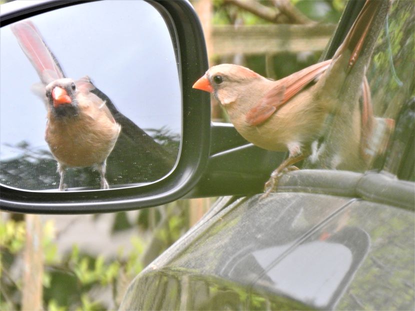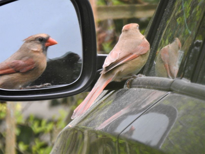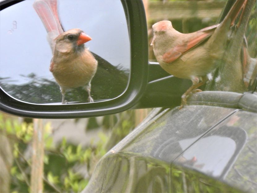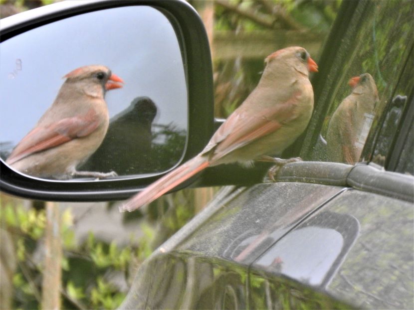 A Moment of March Madness This unusual incident happened on a chilly March morning. I was in my backyard, filling a feeder, when I casually looked across the fence into the neighbor’s yard. I spotted a female Northern Cardinal behaving oddly. She was reacting to her reflection in the sideview mirror of a parked car. I ran into the house and grabbed my camera. She was still there when I returned. In the above photograph, she’s perched on top of the sideview mirror. She’s looking toward the driver-side window, where she perhaps caught a glimpse of her reflection. Cardinals are not capable of recognizing that this is a reflection of themselves. She must be interpreting it as another bird. She hops down and perches on the edge of the driver-side window. From here, she can clearly see her reflection in the window. She lingers momentarily. Turning her head, her eye catches a glimpse of what appears to be another female bird behind her (in the mirror). She swings her body around toward the mirror. Her tail goes up. Perhaps that is some sort of warning position. This is my territory. You better leave! Although it’s only March, this female Cardinal and her mate have probably begun to search for a nest site. This particular backyard is likely part of their staked-out territory. The presence of another female, although not unusual, is something she must deal with. However, the other bird does not seem to respond as expected. She’s telling me to leave! She leans forward for a closer look, peering intently at her own reflection. Is this eye contact perhaps a more serious challenge to her foe? She does not make contact with the mirror or act aggressively. The Cardinal does know what to do. She hops to the top of the mirror, perhaps retreating. Since she can’t seem to drive away the intruder, she seems perplexed and befuddled. Yet her curiosity pulls her back down toward the window to check again for the intruder. She’s caught in a loop, repeating the sequence of movements as she sees her reflection. The unfortunate bird is locked into a ritualized pattern of hopping back and forth between the top of the side-mirror and the edge of the driver-side window. She pauses to consider the reflections in both places, then retreats. This behavior continued until she abruptly flew away after about fifteen minutes. Perhaps her mate was calling. Northern Cardinal male in March The next morning, I checked on whether the behavior happened again, but the car was gone. It was a one-time phenomenon. Timing has always been a key element in my life. I have been blessed to have been in the right place at the right time.Buzz Aldrin Here are some other unusual photo-encounters to check out… Dumpster Divers >>Steeple Sitters >>Birds Perched on Gravestones >>A Young Owl’s Adventures >> Please follow and like: Share this: Share on Facebook (Opens in new window) Facebook Share on X (Opens in new window) X Like this:Like Loading... Post navigation Feet to Stand onIs that a Purple Finch?