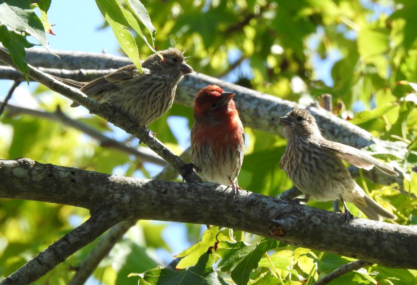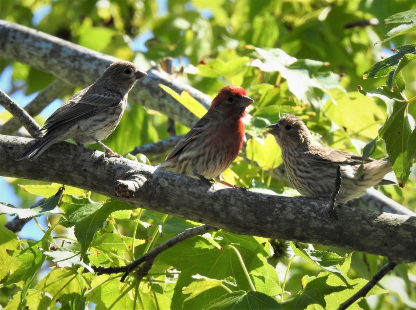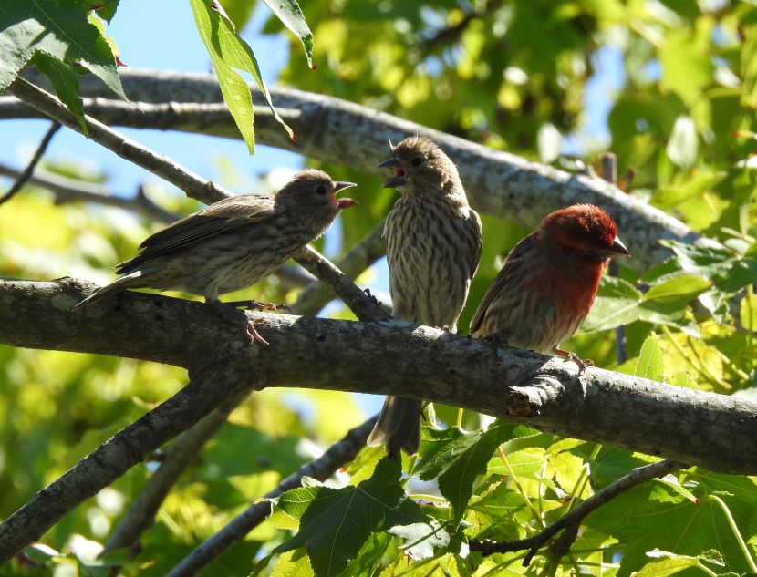 Purple Finches are here in coastal Carolina only during winter months, heading north to breed, maybe as far as Canada. House Finches, on the other hand, breed here between March and August. Young birds resemble their mothers. It’s not uncommon to watch parents attending to young fledglings as in this series of photographs…