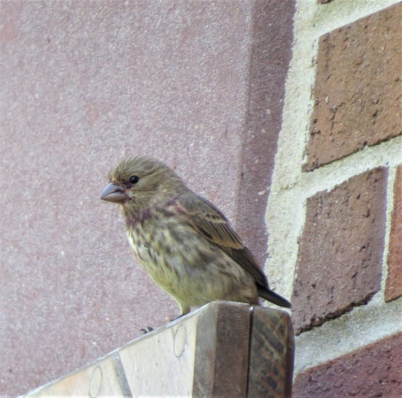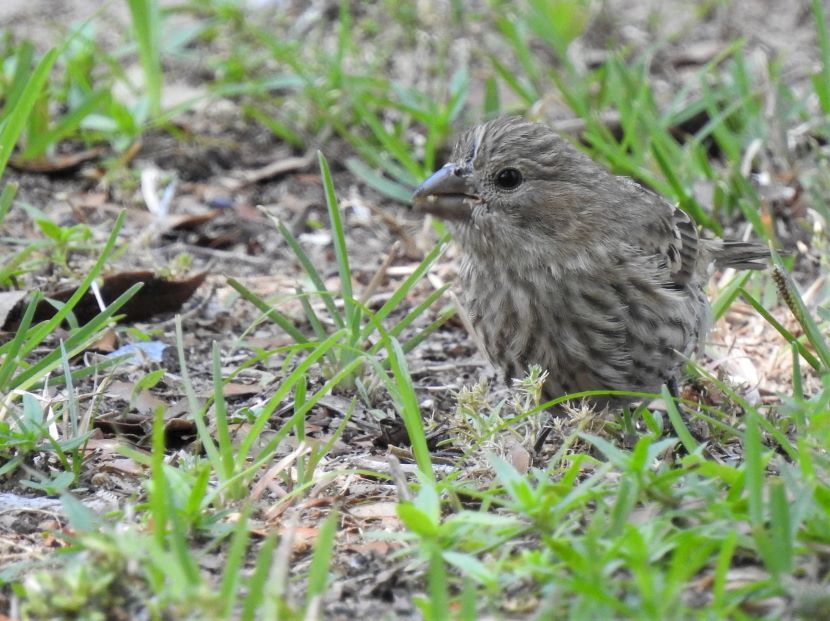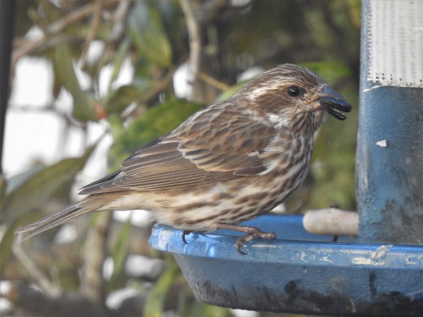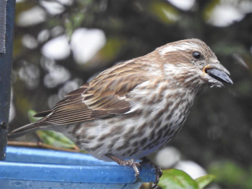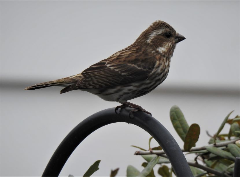 Not only does the Purple Finch have a distinct white eyebrow stripe, but she also has streaks that are crisply defined, compared to the blurry look of the House Finch.