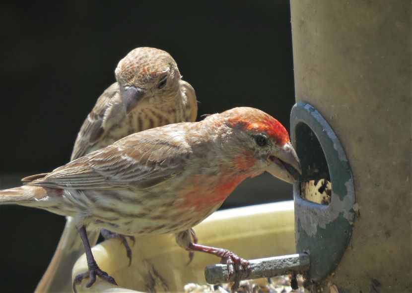 House Finches (Haemorhous mexicanus) come to my backyard feeders often, especially to the one filled with black-oil sunflower seeds. These social birds are easy to recognize even during the winter, as they congregate in groups around the feeder. The males in particular stand out with reddish plumage on their heads, chins and bellies.
